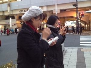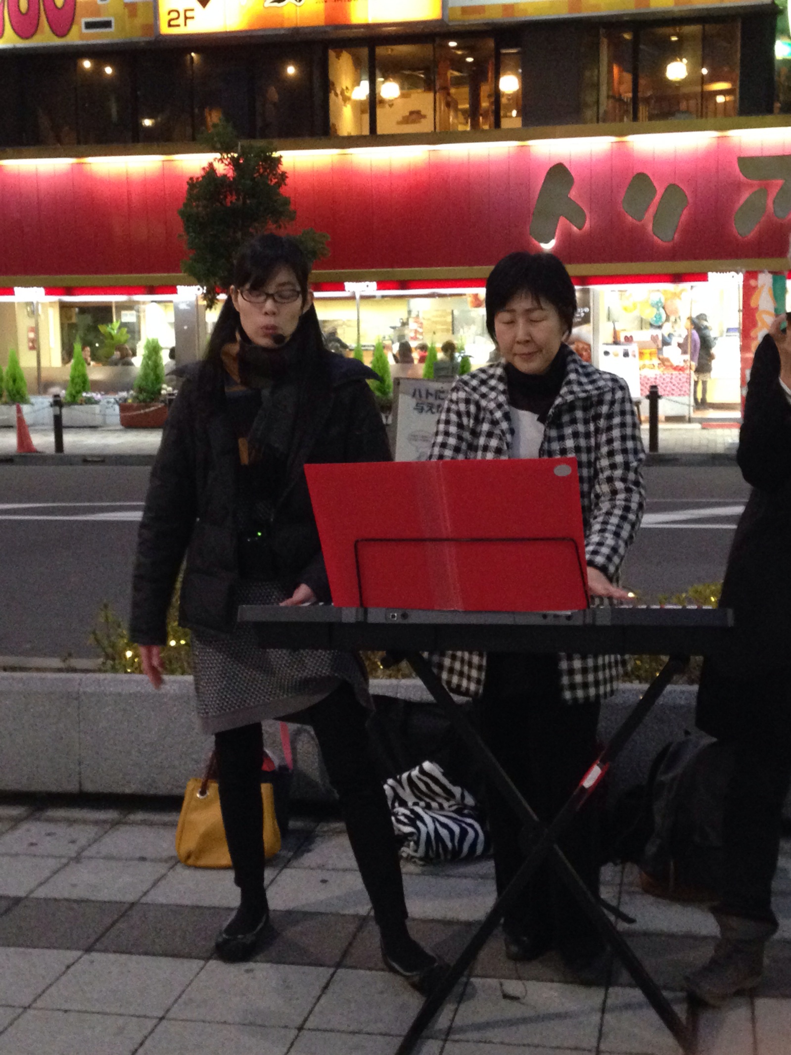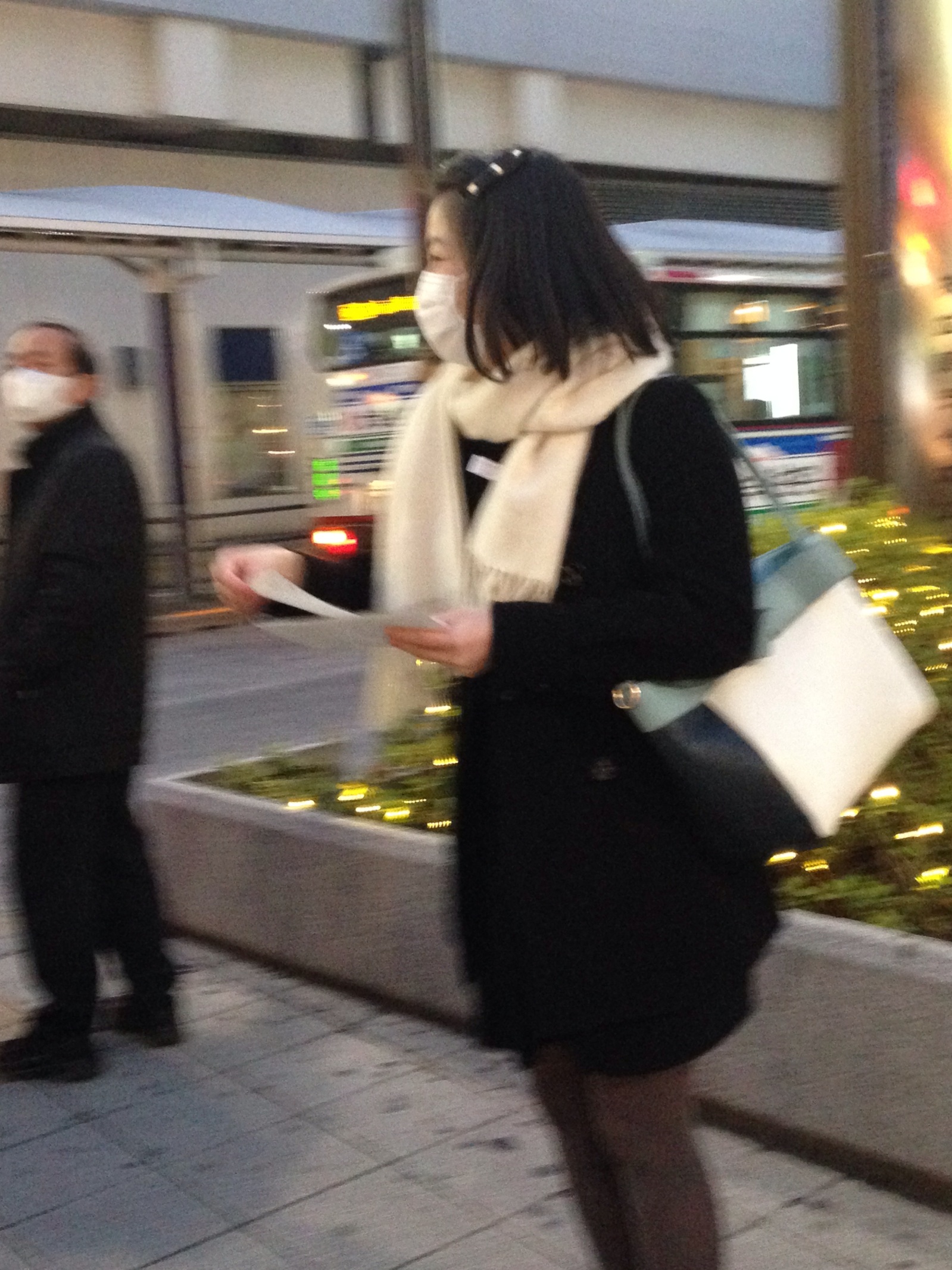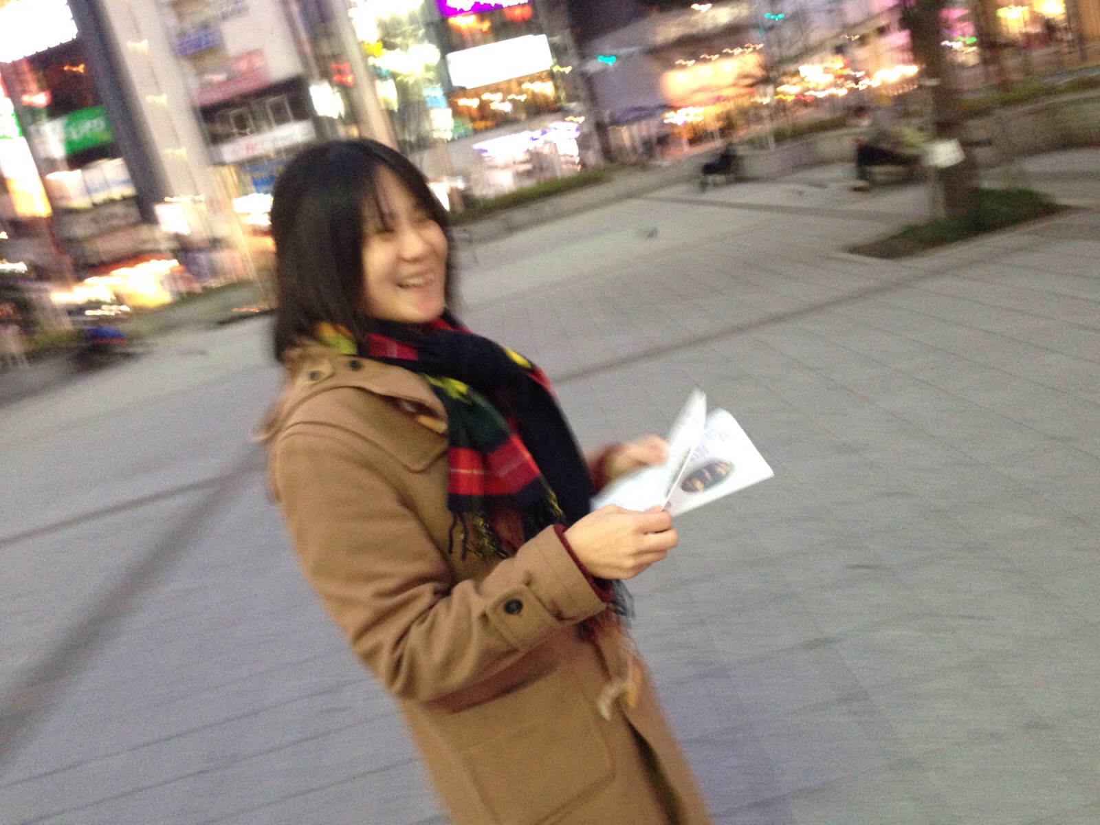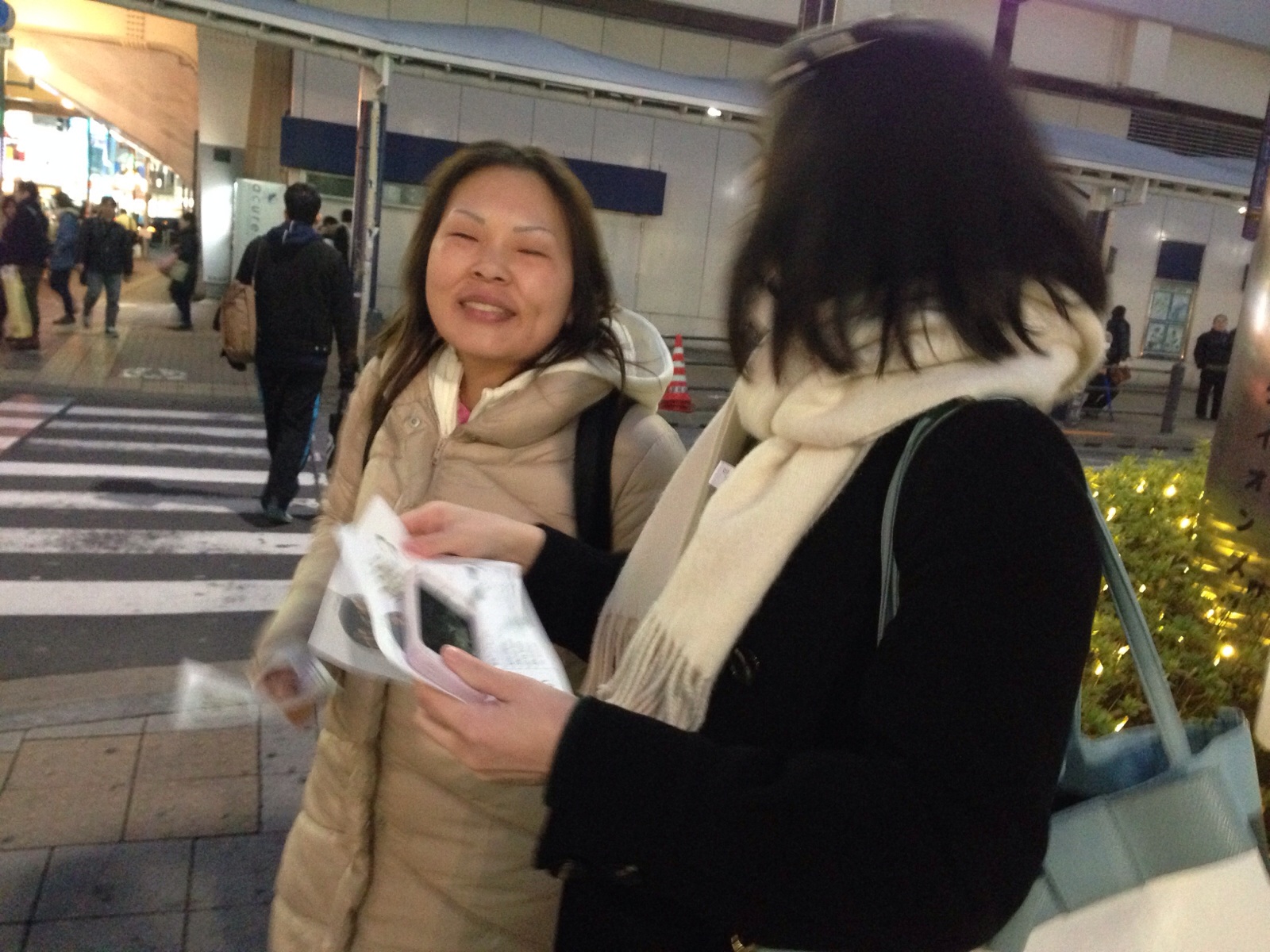 ニコニコ笑顔でチラシを渡すお二人。思わずみなさん受けとってくれてます!