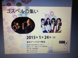明日はゴスペルの集いが、東京アンテオケ教会の会堂で、午後6時30分から行われます。出演は、エウカリスティアスとエルサレムです。