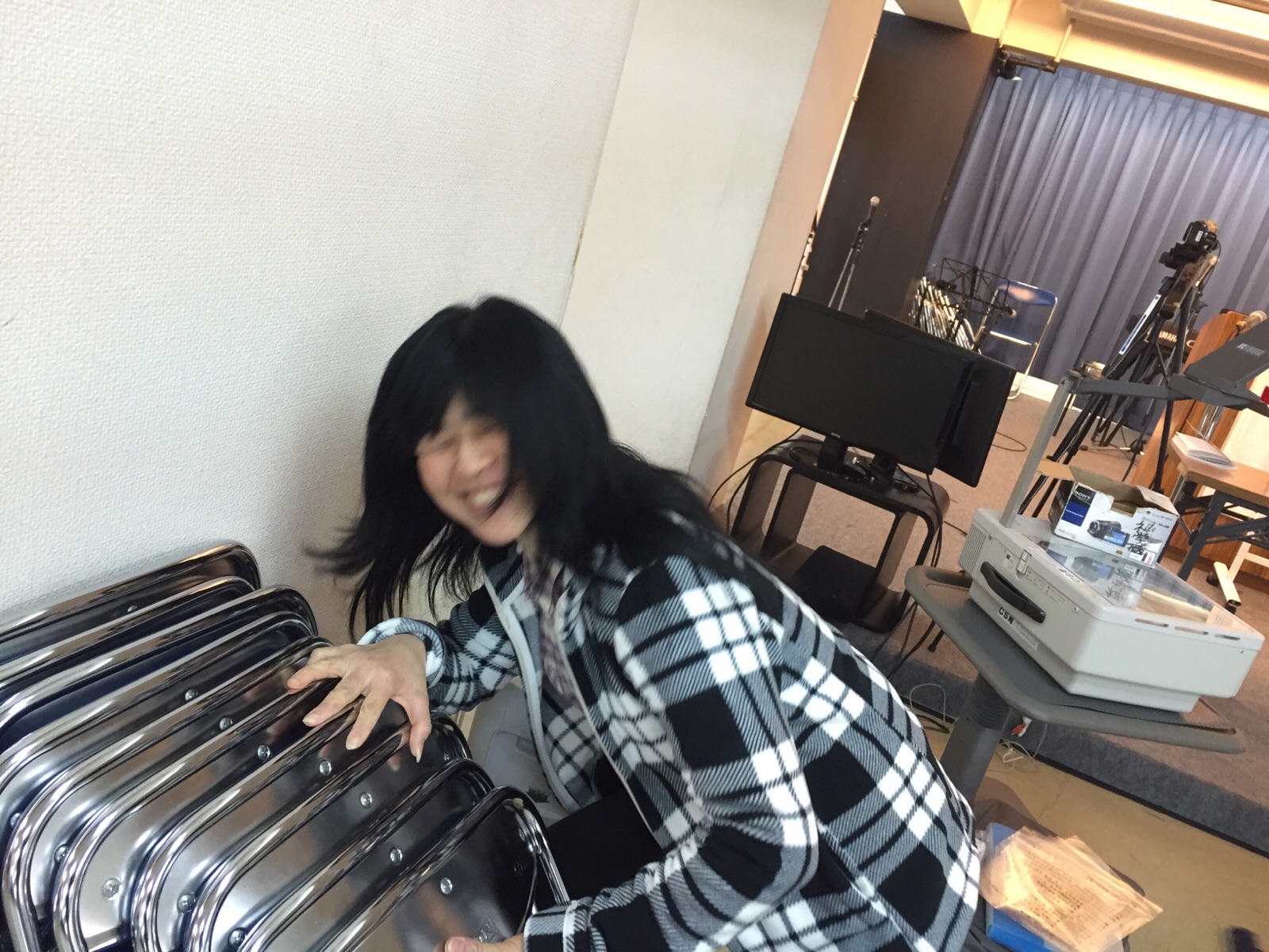 崩れる〜!と椅子を抑えるバイオリニスト稲川さん。グレシャスドアーで出場します。