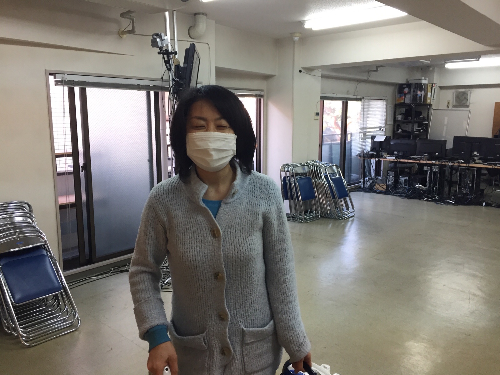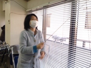 お掃除始め! エウカリの山中さん、ブラインドをあげています!