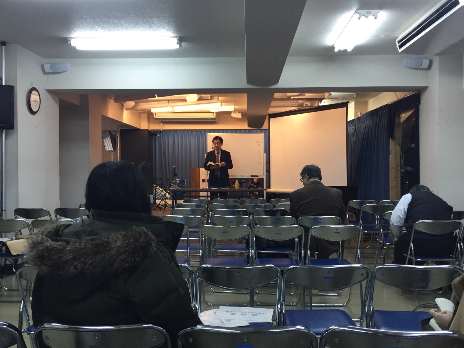 海外宣教2の授業開始です。 マタイの福音書28章18〜20節を朗読しています。