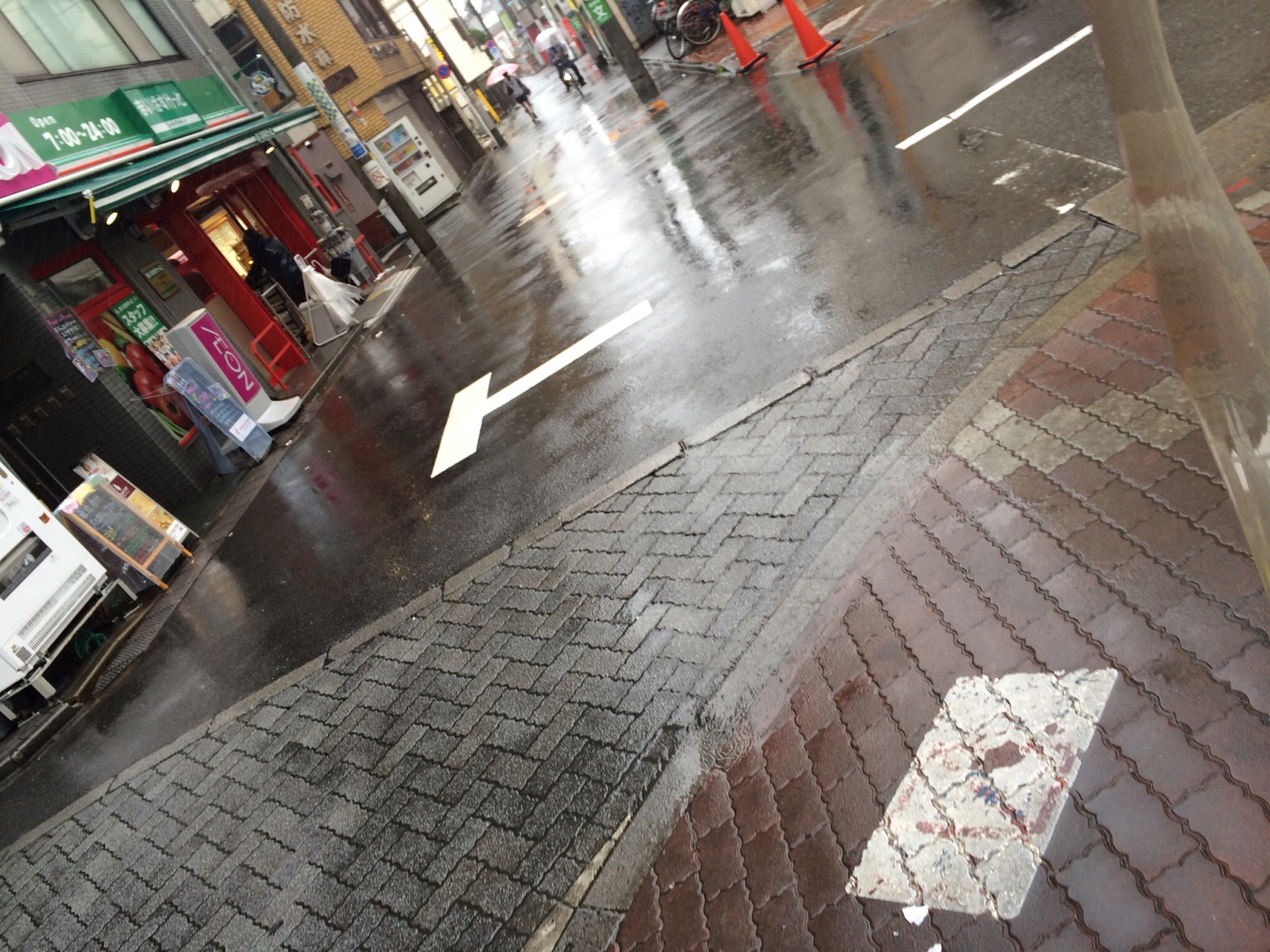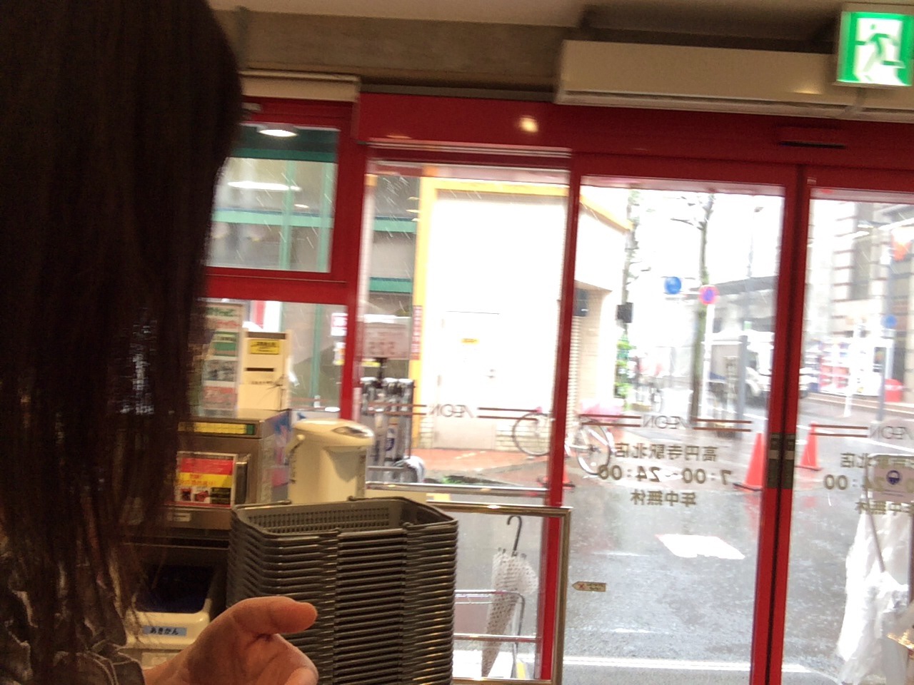 近くのスーパーで、雨宿りしています。