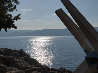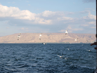 帰りは向こう岸のティベリアに行きますが、途中カモメがたくさんやってきてパンを求めて追っかけてきました。 |
