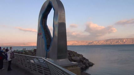 | 船から降りてGaiBeachHotel宿泊の人で歩きたい人は歩いてホテルへ行くことになりました。途中ガリラヤ湖の形をした碑が。なにかと思えば、現在の海抜が表示されていました。その日は海抜マイナス213メートルでした。 | ||||||||||||||||||||||||||||||||||||||||||||